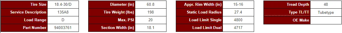 Heavy duty drive wheel tire with dual angled tread lugs, which provide high traction and long life in both, field and on-the-road operations. Strong casing for excellent stability and safety to the operator. Also ideally suited for industrial/construction applications. The Load Carrying Capacity for this product line is based off of the A6 (20 mph) Service Description speed rating, conforming to ETRTO guidelines.