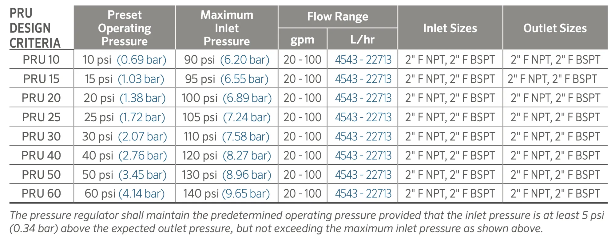 The PRU was designed to handle higher flows of 20 to 100 gpm (4543 - 22713 L/hr). Its 2-inch inlet and outlet size make it an ideal option for accurate zone and individual sprinkler pressure control. Its compact size fits in a valve box.